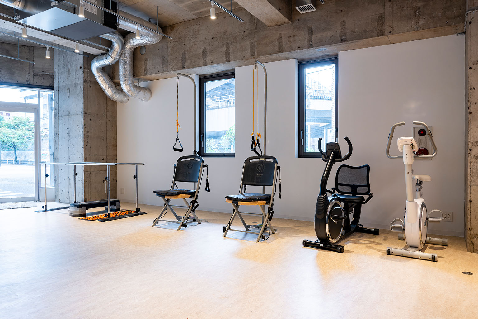 平行棒やエアロバイクなどを備えた訓練エリアでは、ご利用者さまの身体機能に合わせた安全な運動が行えます。専門職による個別訓練もこちらで実施します。