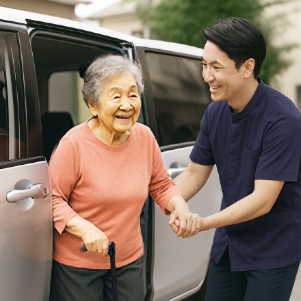 ご自宅と施設間の送迎サービスを実施。安全に配慮した車両と経験豊富なスタッフが、安心して通所いただけるようサポートします。
